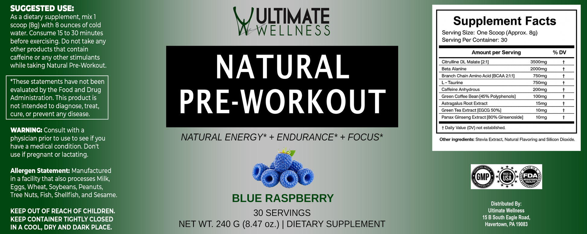 WHEN TO TAKE IT – mix 1 scoop with 8 oz. of cold water, 15-20 minutes prior to any workout. Do not take any other products that contain caffeine or any other stimulants while taking Natural Pre-Workout